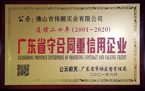 - 佛山市偉順實業(yè)有限公司被廣東省市場監(jiān)督管理局授予連續(xù)二十年(2001-2020)廣東省守合同重信用企業(yè)稱號。