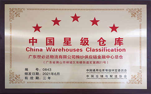 - 廣東世必達(dá)物流有限公司棉紗供應(yīng)鏈金融中心被中國倉儲與配送協(xié)會評定為中國五星級倉庫。