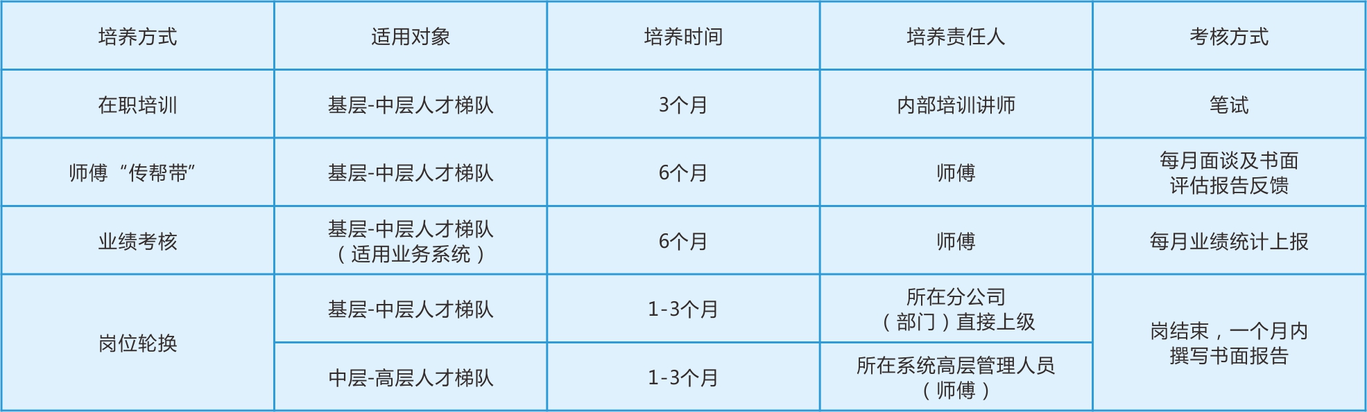 1、將一批有發(fā)展?jié)撡|(zhì)的人才納入公司實(shí)施的人才培養(yǎng)計(jì)劃,發(fā)揮梯隊(duì)人才中堅(jiān)力量的作用。 2、指導(dǎo)與規(guī)范后備人才梯隊(duì)的培養(yǎng)工作,建立后備人才的培養(yǎng)機(jī)制。3、與企業(yè)發(fā)展戰(zhàn)略同步,使企業(yè)在需要時(shí)有人可用。